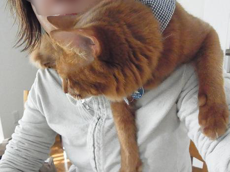 猫キチのお昼ご飯をこっちゃんが肩から狙ってます。