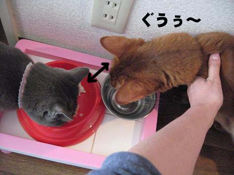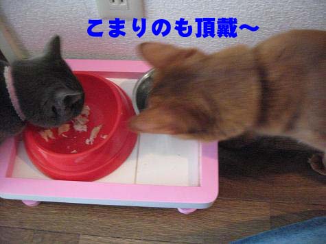 先に食べ終わったこたろうがこまりちゃんのご飯を狙います。