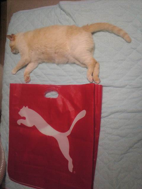 で、そのチャーミーが寝てる下にpumaの袋をおいて写真を撮り「(pumaそっくりになるまで)あとちょっとだな」とか