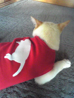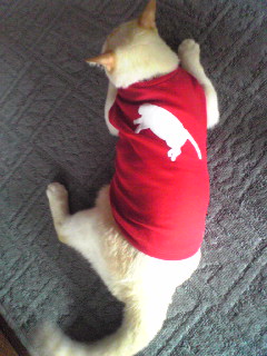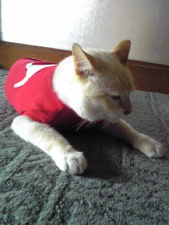 袖も短めにしてもらったので脱ぎ着が楽チン。何よりも猫用に作られたお洋服なので動きの制限もなく、2匹とも普通に着こなしてました。