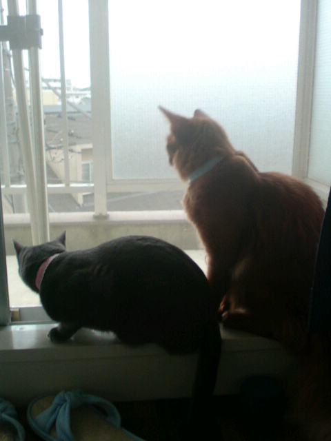 珍しく2匹が揃ってます。大抵こたろうが来た時点でこまりはどこかへ行ってしまうのですが、こまりちゃん、窓の外にあるあるものに夢中。