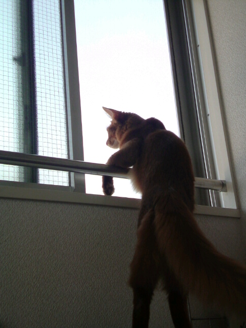 こっちゃんがおっさんみたいな格好でお外を眺めてました。