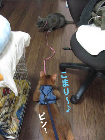 こまりに近寄りたくてしょうがないこたろう。つぶあんさんが必死に阻止。
