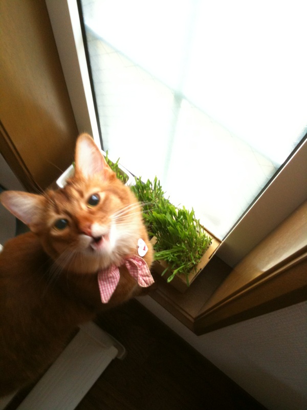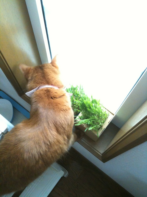 陽のあたる小窓に猫草を栽培しております。