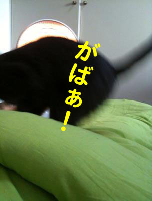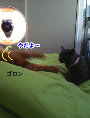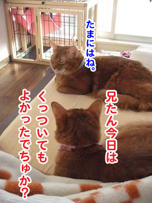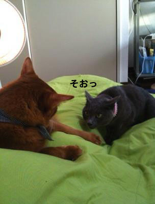 ある日曜日、猫キチがベットでまったりしているとこっちゃんがやってきました。