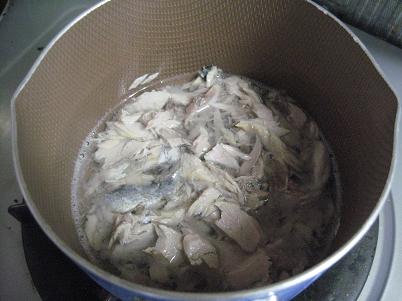 魚を茹でてみたらどうかしら?と思って好都合な事になまり節が売ってたので、ほぐして水分補給も兼ねて更に湯通ししてみました。