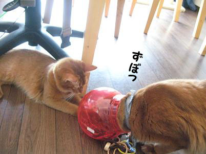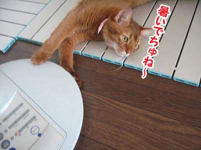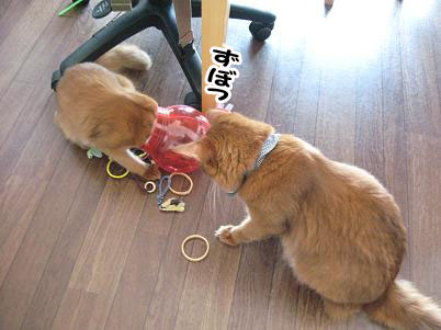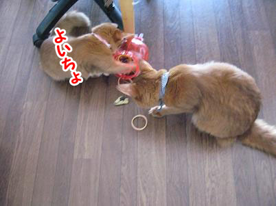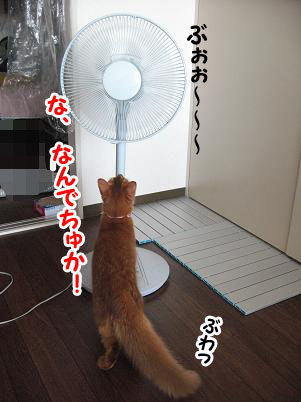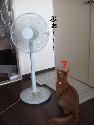 こゆたんが扇風機と格闘中、猫キチはおもちゃの整理をしておりました。